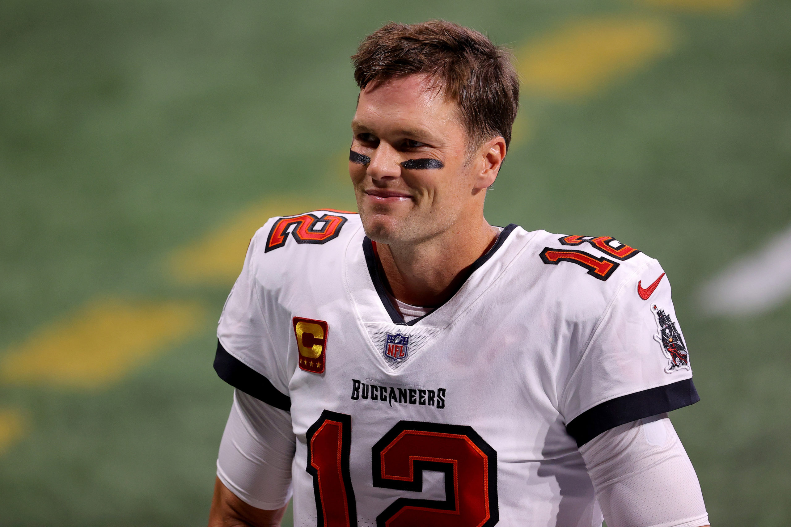 ATLANTA, GEORGIA - DECEMBER 20: Tom Brady #12 of the Tampa Bay Buccaneers smiles prior to the game against the Atlanta Falcons at Mercedes-Benz Stadium on December 20, 2020 in Atlanta, Georgia. (Photo by Kevin C. Cox/Getty Images)